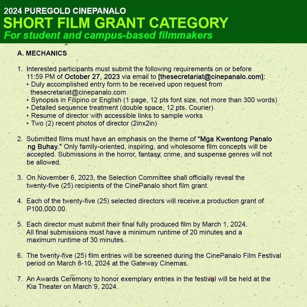 Interested participants may email thesecretariat@cinepanalo.com to receive the materials needed to apply. All applications and requirements must be emailed back by October 27, 2023. A shortlist of selected directors is expected to drop by November 6, 2023.