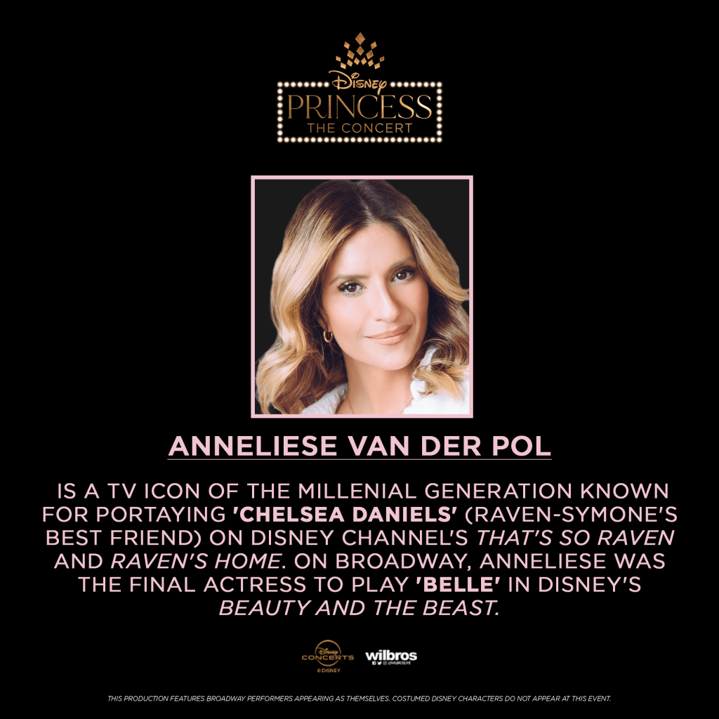 Anneliese van der Pol is a TV icon of the millennial generation, known for portraying ‘Chelsea Daniels,’ Raven-Symoné’s best friend, on Disney Channel’s record-breaking series, That’s So Raven and Raven’s Home. On Broadway, Anneliese was the final actress to play ‘Belle’ in Disney’s Beauty and the Beast alongside Donny Osmond, when it closed at The Lunt-Fontanne Theatre in 2007. Most recently, she’s been having a blast touring the US (and world!) with Disney Princess – The Concert!