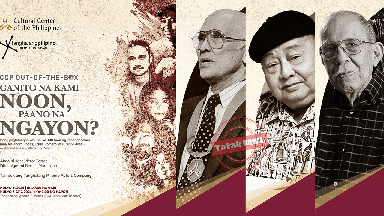 A new play delves into the works of three National Artists to explore Filipino identity through the years: Alejandro Roces (We the Filipinos Are Mild Drinkers), F. Sionil Jose (Po-on), and Eddie Romero (Ganito Kami Noon, Paano Kayo Ngayon?).