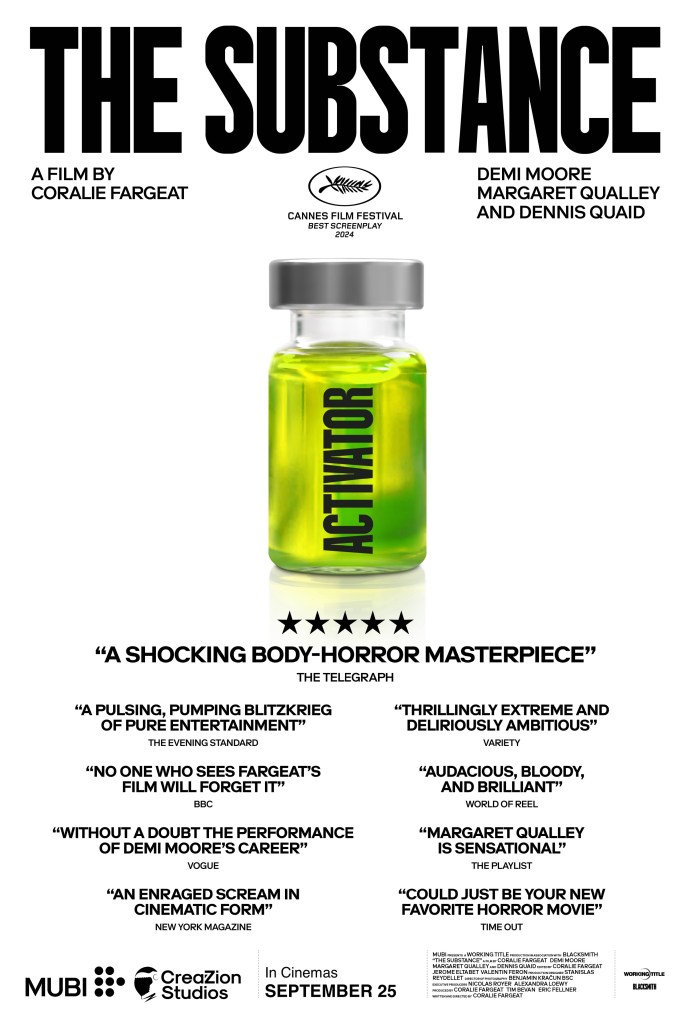 Directed by the visionary Coralie Fargeat, THE SUBSTANCE is a deliriously entertaining and ruthlessly body-horror that eviscerates toxic beauty culture. This Cannes sensation is a be-careful-what-you-wish-for fable for the ages, heralding the comeback of movie goddess, Demi Moore. THE SUBSTANCE dismantles toxic myths through the lens of satisfying genre tropes, blending elements of DEATH BECOMES HER, THE FLY, and CARRIE.