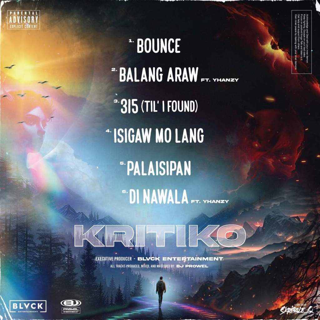Other songs in the digital album are “315 (Ti_l I Found),’ “Isigaw Mo Lang,” “Palaisipan,” “’Di Nawala” (featuring Yhanzy) and “Balang Araw” (featuring Yhanzy). Kritiko, who wrote all the songs in his new digital album, describes his present work as a balance of positive and negative and sends out a message of overcoming the struggles and challenges to fulfill one’s dreams and aspirations. This is evidently represented in his album cover art.