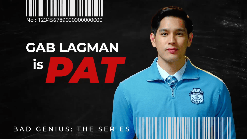 Gab Lagman plays Pat who gets the privilege of studying in a prestigious school only because his family is rich. Although he is struggling in academics, he is undeniably good with money and networking. He serves as the spokesperson to get clients for their cheating scheme.