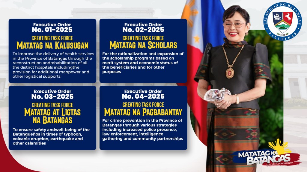 Wasting no time, Governor Santos-Recto signed four Executive Orders shortly after her speech, each aligned with her call for a “Matatag na Batangas”: